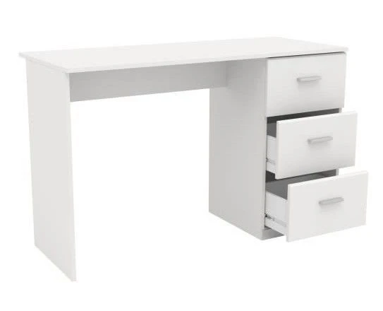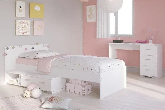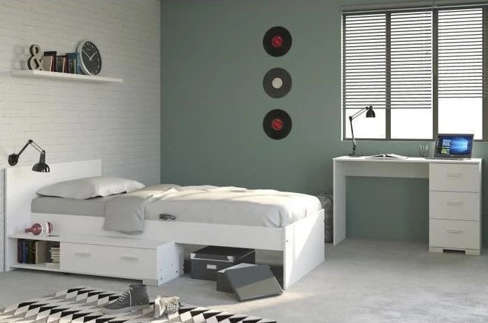 COSMOS Ensemble lit + bureau – Coloris : Blanc – Lit avec 1 tiroir – Montage du tiroir réversible droite ou gauche du lit – 1 bureau 3 tiroirs – Panneau de particules revêtus de papier décor blanc