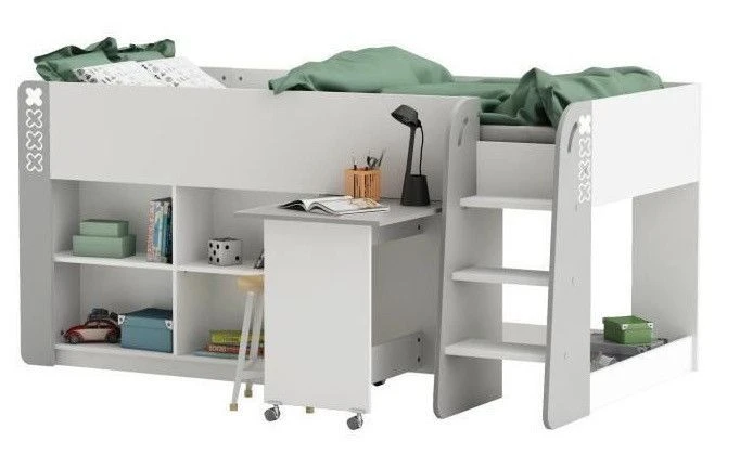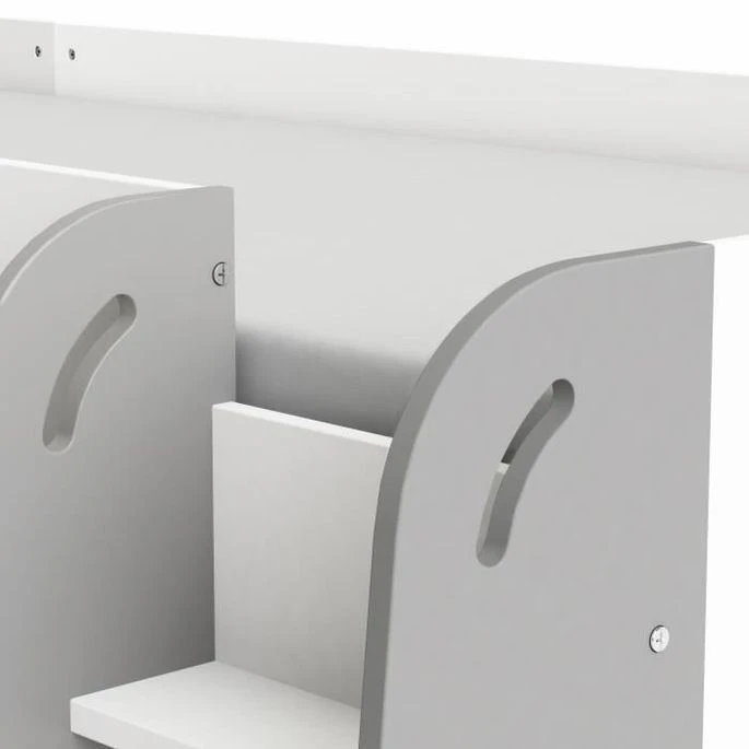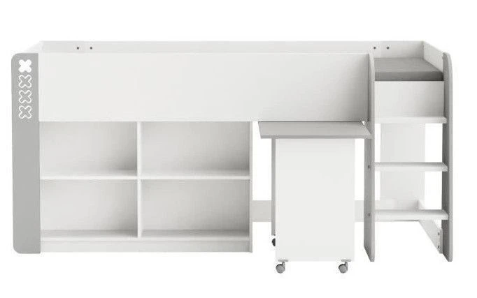 HAMPTON Lit combiné enfant avec bureau et niches de rangements – Coloris Gris/Blanc – Montant et échelle sérigraphiés – Structures en Mdf et panneaux de particules