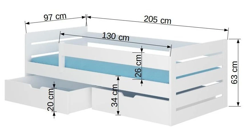 Le lit dispose de deux coffres de rangement pratiques de L 95 x P 80 x H 20 cm chacun.