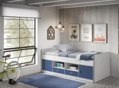 Lit Enfant Multi-rangement 90×200 Cm Bois Blanc Et Bleu Bonny