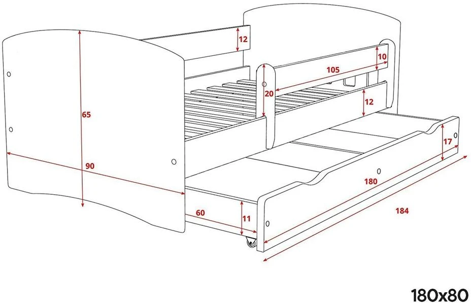 180x80cm – L 184 x P 90 x H 65 cm