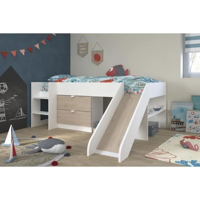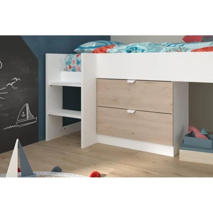 NULEA Lit Gigogne Enfant En Bois Pin Massif Et MDF – Décor Chene Et Blanc -2 X L90 X L190 Cm